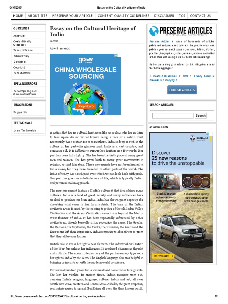 These have been appreciated worldwide. We are proud to be a part essay on heritage of india a country with such a vivacious culture. Indian Heritage is known for its vastness, essay on heritage of india. It includes our cultural heritage, our monumental heritage, our literature and various other works of art. Our heritage dates back several centuries.